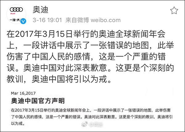 而就在大家谈论这个错误,到底是奥迪有意的还是无心的时候,奥迪中国16日发布官方声明称,使用错误地图,伤害了中国人民的感情,奥迪深表歉意,“这更是个深刻的教训,奥迪将引以为戒。”