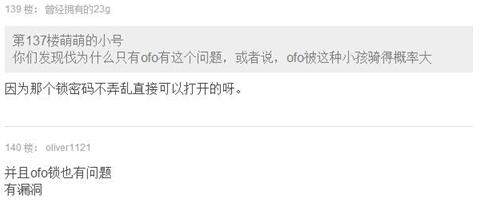 ofo的App也曾被人吐槽是密码本,除了获取密码再无他用。一位用户可以同时开启多辆ofo共享单车。即一位用户将密码告诉他人,他人就可以使用ofo,而该用户在获得密码后立即按结束行程,不仅该辆ofo单车可以继续骑行,该用户还可以输入其他车牌号获取密码继续开锁。另外,骑行之后没有锁车并拨乱密码仍可以在app上按结束行车进行扣费,而不少用户按了结束行程后却忘记了拨乱密码锁,这就给了一些小孩子和其他用户免费骑行ofo的机会。
