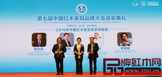 中国传统工艺大师、波记家具董事长伍建波(右)荣获“2016年中国红木家具传承贡献奖”,中国收藏家协会副会长维佳(中)为其颁奖