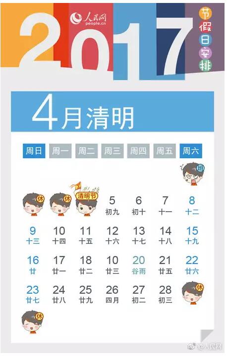 2017年清明节小长假:4月2日(星期日)至4月4日(星期二)放假调休,共3天,4月1日(星期六)上班。请假攻略:如果4月5日、6日、7日请假,连上周末的8日、9日,可以凑足8天长假。此外,4月份还可以蹭上五一劳动节的两天假(4月29日、30日)。(来源:人民网)