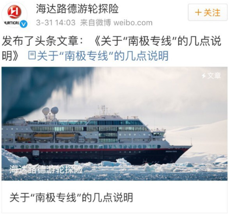 海达路德还在说明中倡议即将开启南极探险的中国游客能与海达路德一同努力,成为南极保护的使者。