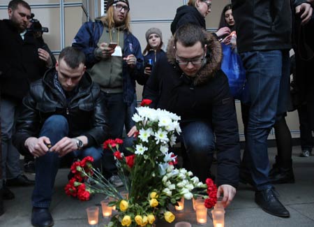图为当日,在俄罗斯圣彼得堡,民众悼念地铁爆炸事件遇难者
