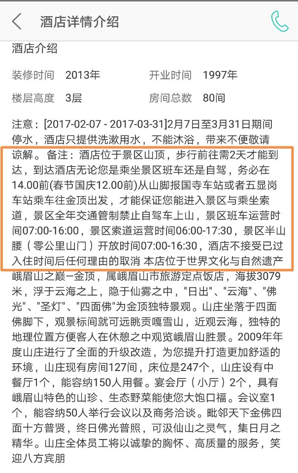 4月4日,记者进入美团网金顶山庄预订页面,发现所有房型在预订时均提示“不可取消”。在酒店详情介绍页内,写有注意事项:酒店位于景区山顶,无论是乘坐景区班车还是自驾车前往,务必在下午2点(黄金周为中午12点)前从山下出发,才能确保进入零公里山门和乘坐金顶索道。注意事项中,同时标注了大致的景区班车运营时间、零公里山门开放时间、金顶索道运行时间。