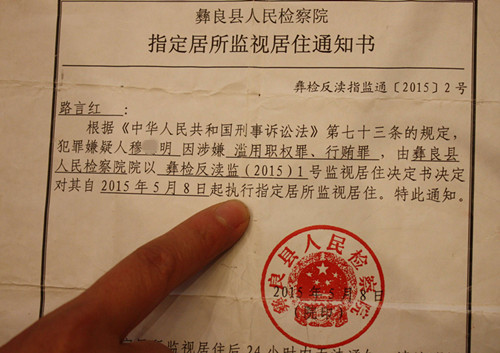 记者看到,在彝良县检察院下达给路言红的《彝良县人民检察院指定居所监视居住通知书》中有这样的表述:根据《中华人民共和国刑事诉讼法》第73条的规定,犯罪嫌疑人穆某明因涉嫌滥用职权罪、行贿罪,由彝良县检察院以彝检反渎监2015(1)号监视居住决定书决定对其自2015年5月8日起执行指定居所监视居住。