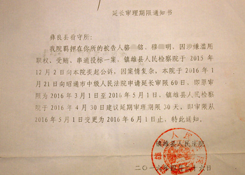 (镇雄县法院出具的延长审理期限通知书)