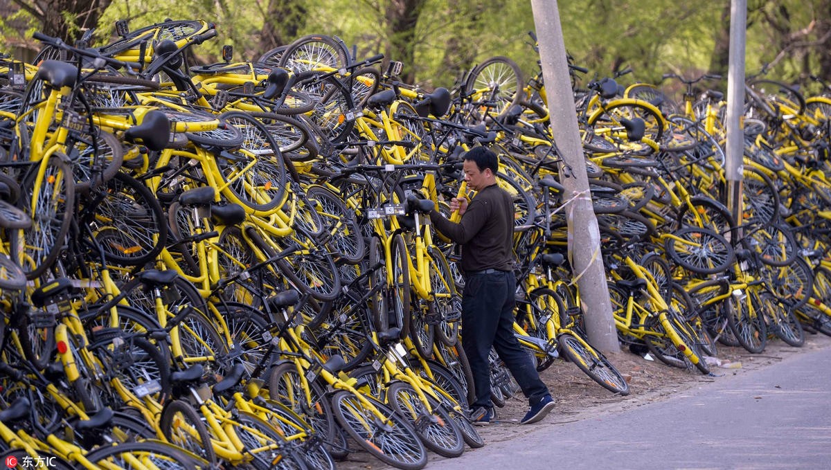 近万辆被损坏的共享单车聚集在一起,等待着维修师傅们修理。