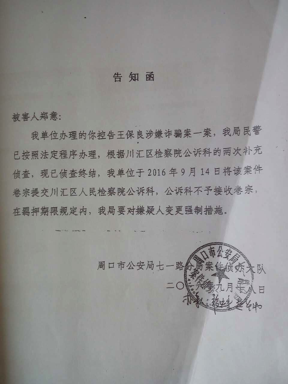 而在决定释放王保良之前的9月18日,七一公安分局发给郑意《告知函》称:“你控告王保良涉嫌诈骗一案,我局民警已按照法定程序办理,并按川汇区人民检察院的要求两次补充侦查,现已侦查终结。9月14日,我局将案卷提交川汇区人民检察院,该院不予接受。由于羁押期限的原因,我局将对王保良变更强制措施。”对此,郑意认为,七一公安分局的《告知函》有与川汇区人民检察院区分责任的意思。