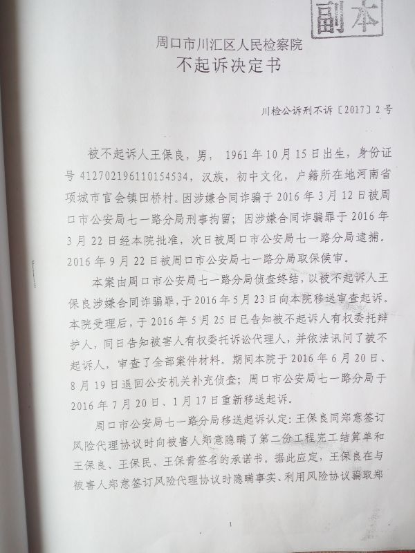 陈情无果后,川汇区人民检察院收下案卷,却在不回应郑意的《回避申请书》的情况下,赶在2017年2月6日下午对该案作出《存疑不起诉决定书》,并催促郑意领取。