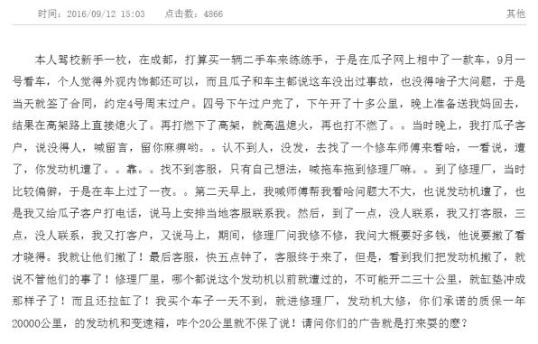 在发达国家,二手车交易已经十分普遍,但在我国仍有大量消费者抗拒购买二手车。究其原因,除了国民消费习惯尚需培养外,市场环境的影响也许占比更大。车况不真实、检测标准不统一、胡乱收费等问题成为消费者购车的拦路虎。去年9月,来自四川成都的市民蒋先生,就在某投诉平台曝光了自己在瓜子二手车直卖网买到事故车的经历。
