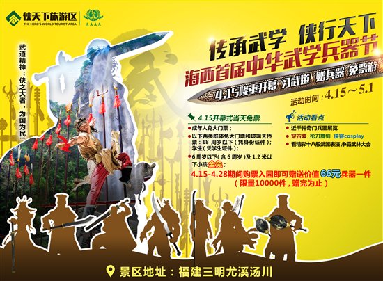 为让更多人参与到弘扬中国优秀传统文化的活动中,4.15开幕式当天侠天下旅游区免门票!免门票!免门票!
