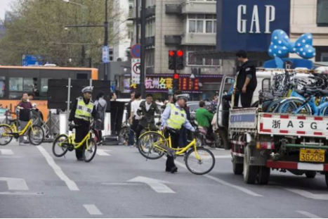 上面提到的“上海交警大规模收缴ofo共享单车”得照片经过笔者调查之后,原来是清明小长假期间,西湖边有很多乱停的共享单车,这是杭州上城交警协管员在平海路延安路口清理乱放违停的共享单车。