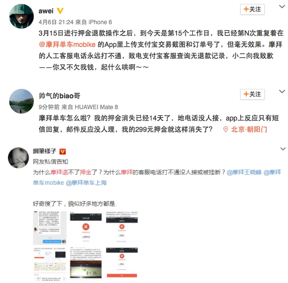 从工商局3月20日发文至今,二十多天过去了,“退款问题”显然仍未解决。近日不断有用户反映,虽然查看摩拜app时显示押金已退,可过了好几天押金并未到账,甚至有用户碰到逾期30天收不到款的情况。摩拜技术部门则将问题指向第三方支付平台,称运营商的“产品设计”缺陷是退款延迟主要原因。