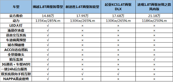 吉利博越主打卖点确实跳脱出众:智能安全、智能互联、智能舒适,智能概念已经全方位覆盖这款车。另外,从外观 LED大灯、到内饰的液晶仪表盘、再到NAPPA真皮座椅,博越一应俱全,其他对标三款车型却是疝气大灯和皮/织物混搭座椅的组合,难免有点落后时代的感觉。更重要的是,吉利博越和途观一样全系标配EPS、上车辅助、自动驻车等功能,但是,博越还搭载的车道偏离预警,城市预碰撞系统、ACC自适应巡航、全景摄像头、胎压监测等更加智能、更加安全的配置,途观风尚版却只包含胎压监测系统这一项,着实令人汗颜。