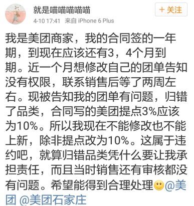“我是美团商家,我的合同签的一年期,到现在应该还有3,4个月到期。近一个月想修改自己的团单告知没有权限,联系销售后等了两周左右。现被告知我的团单有问题,归错了品类,合同写的美团提点3%应该为10%。”所以我现在不能修改也不能上新,除非提点改为10%。”
