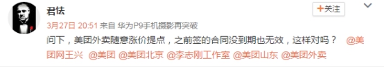 无独有偶,网友@君怯 也遇到了同样的问题。做外卖的他,遭遇的是美团外卖随意涨价提点,而且美团宣称此前签约的合同,就算没到期也无效。“这样对吗?”@君怯 问道。