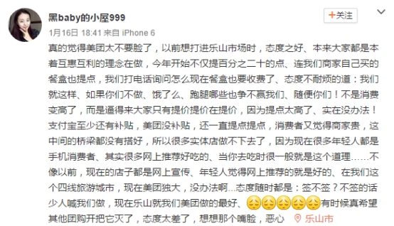 “支付宝至少还有补贴,美团没补贴,还一直提点,消费者又觉得商家贵,这中间的桥梁都没有搭好,所以很多实体店做不下去了。”@黑baby的小屋999 表示。