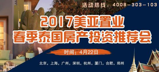 由海外房产机构优质品牌——美亚置业集团举办的“2017春季泰国房产投资推荐会”,将于4月22日(星期六),在全国北京、上海、广州、深圳、厦门、杭州、郑州、合肥等8个城市举办。现场将推出泰国曼谷、清迈、普吉岛等热门地区多套优质房源,总价低至36万起,首付低至9万起,置业泰国so easy!