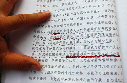 “鄂尔多斯中院开庭时,我们惊讶地看见赵其手里有我们的借条!”白杰称,“我夫妇于2011年1月25日晚与赵其把双方借款结算后,赵其将所有借条归还给我们了。但鬼使神差,我没有像别人那样把借条毁掉,就向法官出示了,但他们没有让我们详细说明情况,就判我们付赵某235.2万元。虽然这个数目与赵其的诉求有极大的差距,可他没有上诉,反而是我们上诉了。”
