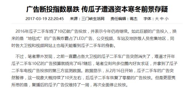 确实,在今年年初,瓜子二手车CEO杨浩涌还在多个公开场合对外宣布,2016年瓜子二手车的广告战略取得了非常好的成绩,今年仍将保持10亿广告投入。但在新年过后,就有媒体曝出瓜子二手车的电视广告停播的消息。