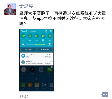 一直倍受诟病的摩拜单车信息骚扰,在近日又有升级之势。4月16日,《商业伙伴》总编辑、原《电脑商报》执行总编于洪涛朋友圈投诉到,摩拜单车安卓版直接向用户推送大量营销信息,且从APP中无法关闭。