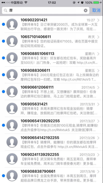 这并不是个例。在新浪微博上搜索“摩拜 短信”,就可以发现,除了利用APP直接推送大量无法关闭的消息之外,短信轰炸骚扰也令摩拜用户不堪其扰。用户在回复了“TD”(退订)之后,摩拜就会换一个帐号发布骚扰短信。甚至有些短信推送选择在深夜发布,被用户评选为“最扰人的APP没有之一”。
