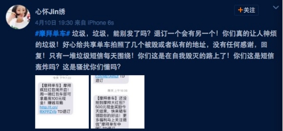 “摩拜单车是天下最讨厌的东西,比狗皮膏药还烦人,注册绑定手机以后变着花的发垃圾短信,回退订没用,他们有一卡车号接着发,数了数我已经退订过五次了,照样垃圾短信轰炸个没完,本来就一次也没骑过,这下更不打算骑了。”网友@碎纸鸡 表示。