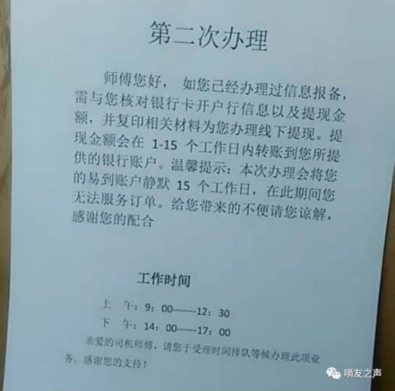 据说,每天易到线下俱乐部都有车主聚集,为了提现的事,在那里与易到工作人员斡旋,有点像是在打攻坚战。有人表示,易到员工都声称自己工资还没发,对提现事宜爱莫能助。不过,有车主分享了易到线下俱乐部的提现通知单。