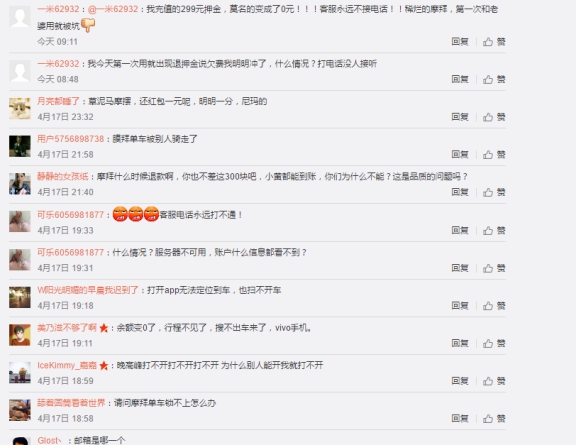 从图中可知,用户评论发表于4月17至18日,也就是摩拜疑似回应押金质疑的同时间段。有网友对此评论道,“说的比唱得还好听,早知如此,何必当初啊。你这样一次次伤害用户,我们不会再相信你,累觉不爱了。”