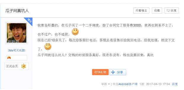 日前,百度贴吧一则名为《瓜子网真坑人》的帖子,曝出了瓜子二手车直卖网随意克扣消费者定金的事。据楼主描述,其在瓜子网上买了辆二手瑞虎,签订合同交了服务费之后便联系不上瓜子的销售人员了,过了十多天也没有顺利过户,瓜子也没有退还订金,更过分的是买家一直得不到售后回应。