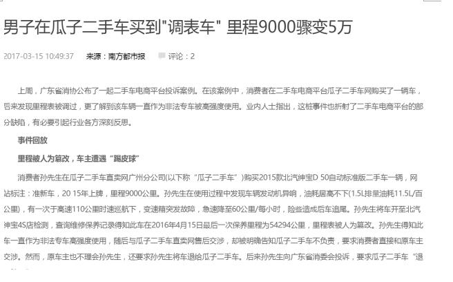 这件事曾经被广州315公开点名批评,买家孙先生在瓜子二手车上购买的二手车,在去4S店维修时骤然发现原本只驾驶9000公里的汽车实际里程为50000公里。公然售卖调表车,只是因为技术不达标吗?