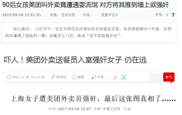 美团外卖员工除了打人,更是曝出过强奸女用户的恶性事件,各位可以看下下面3则新闻的时间横跨三年,可见其人员素质一直问题重重,且多年未得到解决。