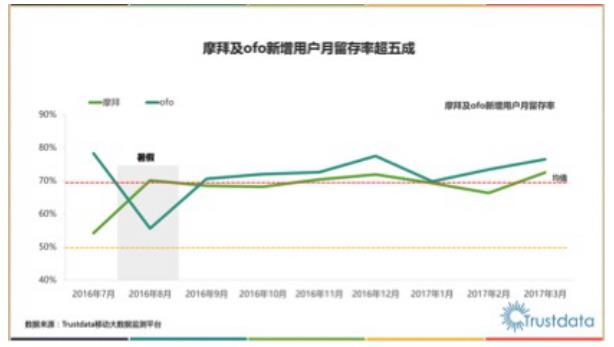 近日的TrustData《2017年Q1中国共享单车行业用户监测报告》也显示,自2016年9月ofo进军城市之后,其新增用户的月留存率始终高于行业70%的平均水平,且连续7个月超过摩拜的新增用户月留存率。显然,相比于摩拜,用户更倾向于选择ofo小黄车。