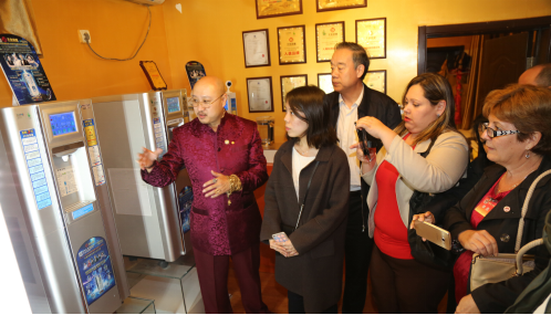 图一:吴达镕教授向古巴考察团一行介绍了“鲜榨空气水”