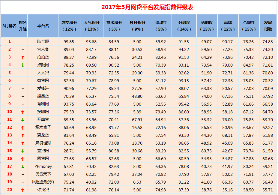 日前,中国首家权威p2p网贷投资理财行业门户网站网贷之家发布了《2017年3月网贷平台发展指数评级排行榜》,评级报告显示,陆金服、宜人贷、拍拍贷、点融网等知名互联网金融平台发展指数榜上有名,其中,宜人贷居于第二位。此评级是根据网贷之家数据库采集的2000多家P2P平台最近3个月交易数据编制而成,评级指标众多,有很强的分析及参考价值。