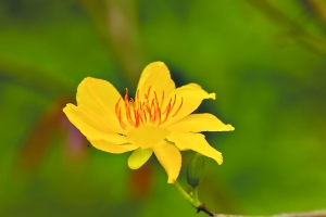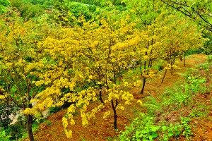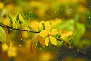 东莞市林科园位于大岭山森林公园内。站在登山道上远眺,只见树木葱郁的山坡上突现一片艳丽的黄。走近看,这黄花形似梅花,有五片花瓣,雨水之下,更显艳丽。这便是桂叶黄梅。