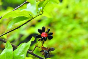 花瓣凋落之后,变红的花托与黑色的果实看起来像红着脸的“米老鼠”。