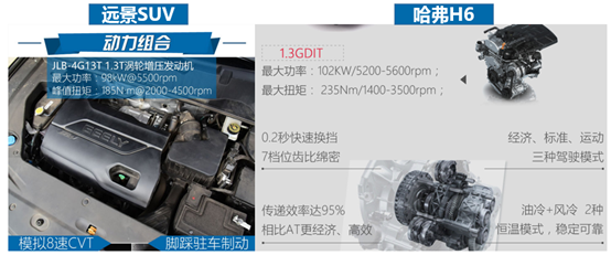 两款车型的表现均不错。我们首先来看下远景SUV,搭载全新“1.3T+CVT”高效动力组合, 驾驶起来不会有拖沓的感觉,而且CVT变速箱手动模式非常实用,因为这款车型使用的发动机是吉利的第二代发动机JLB-4G13T,他相比于吉利的帝豪车型上,涡轮的体积更小,只有起步时需要经过短暂的转速提升时间,而且CVT变速箱在城市的道路中也会获得非常平顺高校的驾驶体验;而新款哈弗H6在4月19日上海车展上新一款新的车型,该车分为红蓝标两种,他的发动机是长城家族代表性的GW4B13,并且搭载1.3GDIT缸内直喷+7DCT湿式双离合,所以从动力上来看,两者基本上不分伯仲。