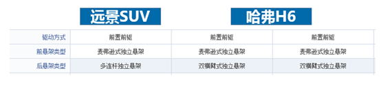 远景SUV的后悬架是多连杆独立悬架,而哈弗H6是双横臂式独立悬架,多连杆悬架可以有11种不同角度调校,用看的见的角度,实现看不见的舒适,路况百变,舒适不变,所以车身稳定性会更好一些,城市内部跑起来平顺程度也会更胜一筹,而哈弗的后悬架事双横臂式独立悬架调教角度就会相应减少一些,稍显笨重。