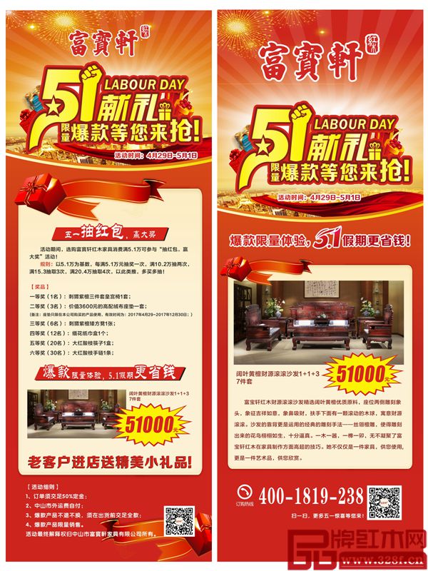 中山市富宝轩家具有限公司(以下简称富宝轩)五一献礼,限量爆款等您来‘抢’!活动于4月29日-5月1日三天火爆进行,与您一起分享8小时工作,8小时休息,8小时娱乐的健康五一小长假,为您钜惠献大礼。