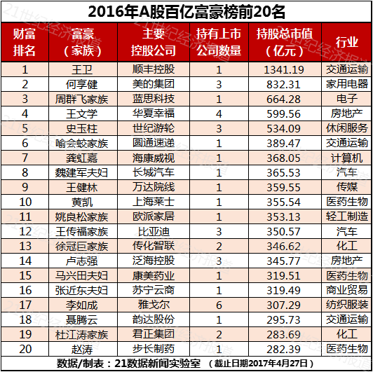 A股百亿富豪榜再刷新,王卫登顶。对比2016年中期统计的百亿富豪榜前20名单,名次波动较大。