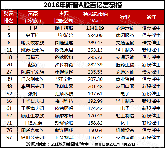 这110位百亿富豪榜中,新晋百亿富豪有16位,其中和王卫类似,通过借壳登上A股百亿富豪榜的有6位,包括史玉柱、喻会蛟家族、聂腾云家族、陈德军家族、肖永明家族、周晓光家族,可以发现快递行业四巨头都登陆了A股百亿富豪榜。