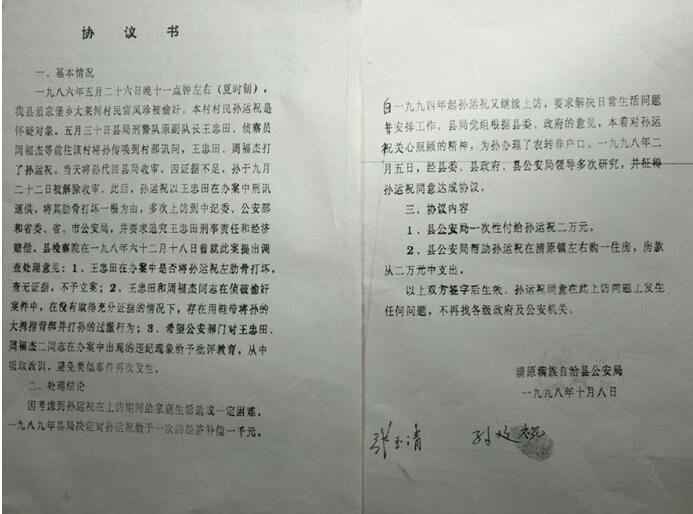 1998年10月8日,清原县公安局与孙运祝达成《协议书》,协议书内容有如下表述:一、县检察院在1986年12月18日曾就此案提出调查处理意见:1、王忠田在办案中是否将孙运祝左肋骨打坏,查无证据,不予立案;2、王忠田和周福杰同志在侦破偷奸案件中,在没有取得充分证据的情况下,存在用鞋带将孙的大拇指背绑并打孙的过激行为;3、希望公安部门对王忠田、周福杰二同志在办案中出现的违纪现象给予批评教育,从中吸取教训,避免类似事件再次发生。二、县公安局党组根据县委、县政府的意见,本着对孙运祝关心照顾的精神,为孙运祝办理了农转非户口,并一次性付给孙运祝二万元;县公安局帮助孙运祝在清原镇左右购一住房,房款从二万元中支出。以上双方签字后生效,孙运祝同意在此上访问题上发生任何问题,不再找各级政府以及公安机关。