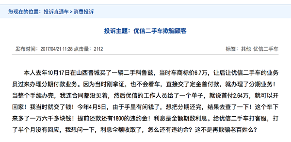 近日,消费者通过网上投诉平台发布了自己在优信二手车购车被骗的经历。消费者称,自己在优信二手车上购买了一辆价值6.7万元的二手科鲁兹,并办理了优信分期业务。消费者称,在整个办理手续过程中优信二手车的工作人员只是告诉他首付2.64万元就能开回家,并要求消费者在一个单子上签字。消费者表示,自己全程都没有看到合同。