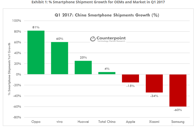 在Counterpoint的报告中,市场研究分析师指出,与一年前相比,OPPO是中国增长最快的品牌,每年出货量都保持增长状态。除了借助于有效的和非常明显的线上和线下的推广营销,创造一个一致的需求拉动。此外,OPPO品牌一直以来注重产品质量、设计,并整合最新的相机技术利用自拍热潮,促成了OPPO的成功。