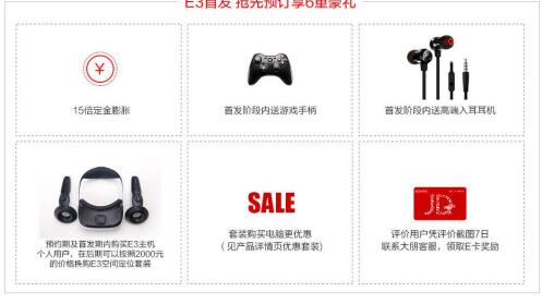 预售期间及首发期,用户预订购买可获得20抵300、无线蓝牙游戏手柄、高端入耳耳机,PC电脑及推荐显卡优惠套装、低价换购E3空间定位套装等优惠福利。