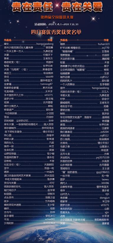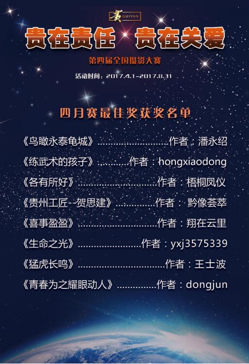 初夏时季,黔中大地,草木葱郁,风景如画。“贵在责任 贵在关爱”第四届全国摄影大赛,四月月赛获奖名单在这繁花盛开的季节正式揭晓。