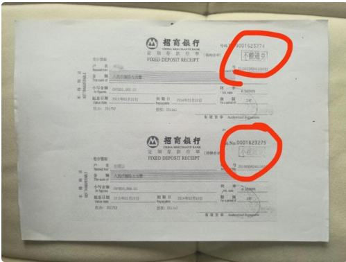 图片说明:被冻结的两张存单标红处(不能通兑)