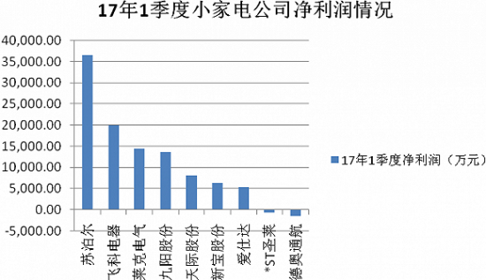 其中,净利润第一名为苏泊尔,2017年实现净利润3.66亿元;紧随其后的是飞科电器以及莱克电气,分别实现净利润2亿元和1.46亿元;德奥通航因一季度为销售淡季且公司通用航空业务拓展产生相应费用使得净利润最少,为-1490.29万元。