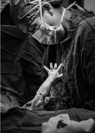 拍摄者进入产房进行全程拍摄,记录下了新生儿诞生的瞬间。在紧张和严肃的场景里,拍摄者还能冷静的记录,并抓拍到了小手用力抬起的一刻。让观者看到作品,有一种对于生命的敬畏之心。不禁感叹:生命是脆弱的,却也是如此顽强的。