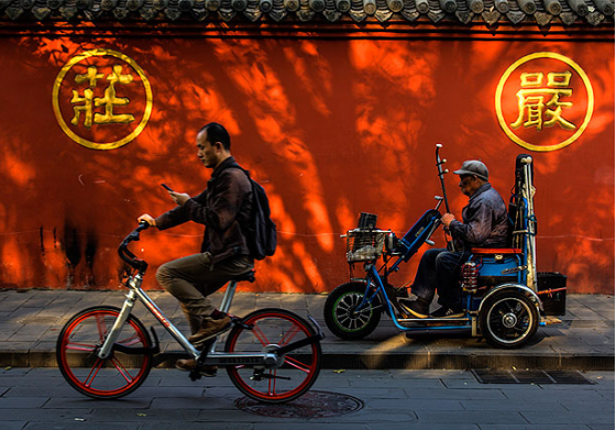 摄影作品打动人,有很多方面。一是因为拍摄技法的高超,二是让人能从中读到让众人反思的社会现象。而这幅作品正好属于后者。在一个光影非常棒的午后,年轻男子在路上骑车看手机,老者在人行道上坐着拉二胡。原本不相干的两人被拍摄者巧妙的组合在一起,不禁让人沉默。你可以理解为两代人之间的鸿沟;也可解读为当今社会的冷漠;又或者是骑车不要玩手机的善意提醒。